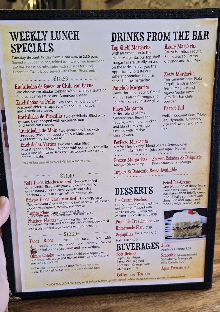 “ Service was fantastic and food was delicious. We started with queso and a Raspa Rita Flight... Then we got chicken fajitas and the Pancho's combo with an Olmos Taco. We'll definitely be back! ”